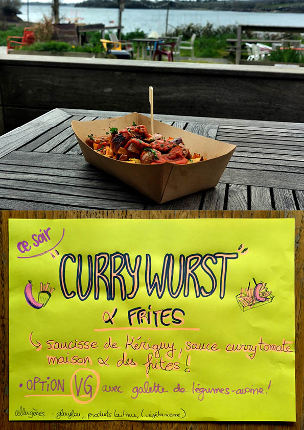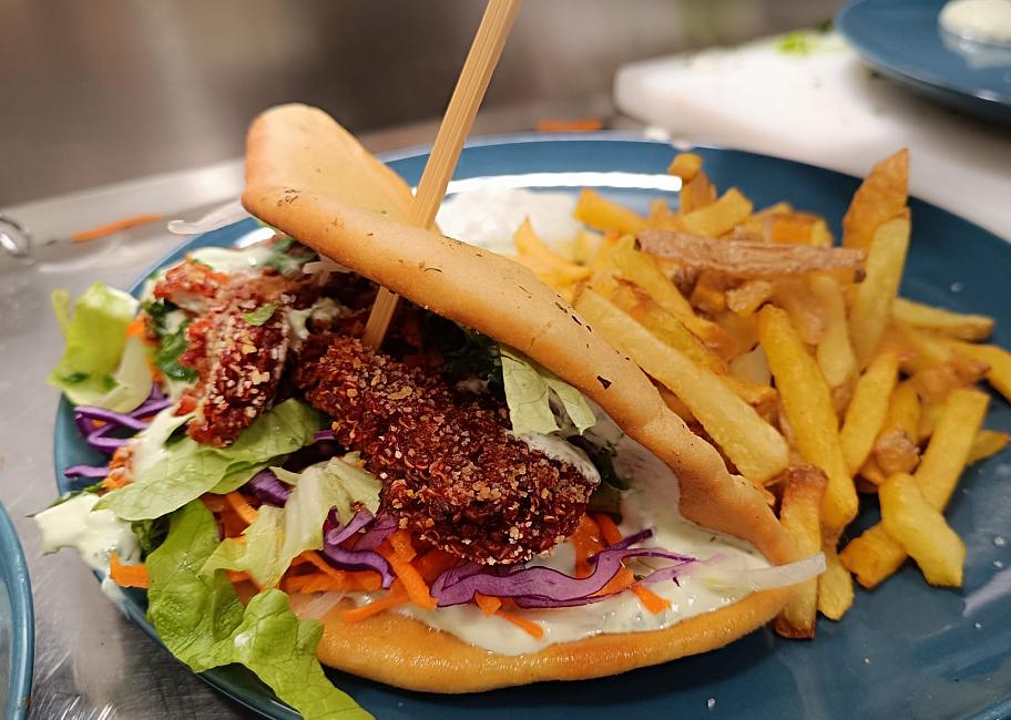 Le Gyros de l’ancre, c’est un pain pita maison, frit à l’huile d’Olive grecque et garni de légumes crus et frais de saison (oignon, chou rouge, carotte, salade verte), de morceaux de saucisse dorés, et d’une onctueuse sauce yaourt aux herbes fraîches et au citron. Une version végétarienne existe avec des galettes de légumes et de quinoa.